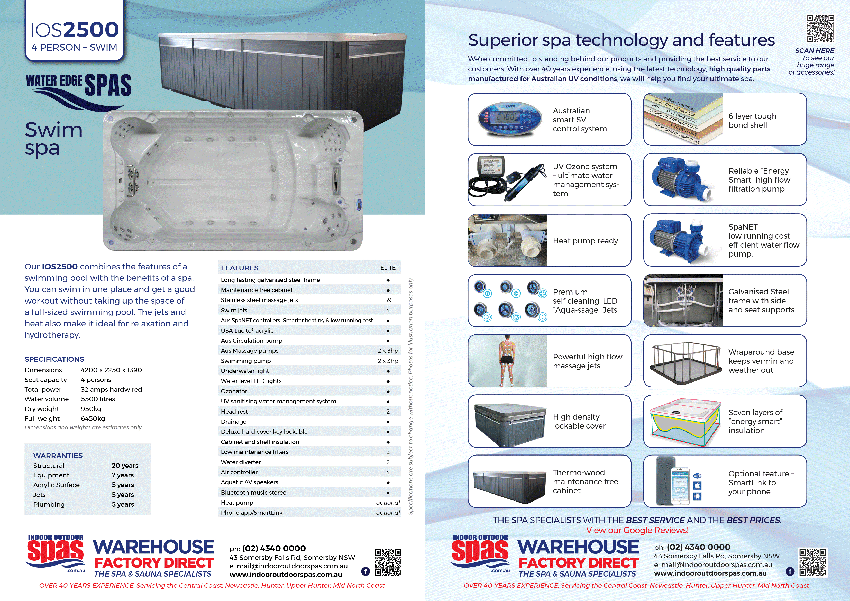 Our IOS2500 combines the features of a swimming pool with the benefits of a spa. You can swim in one place and get a good workout without taking up the space of a full-size swimming pool. The jets and heat also maki it ideal for relaxation and hydrotherapy.
