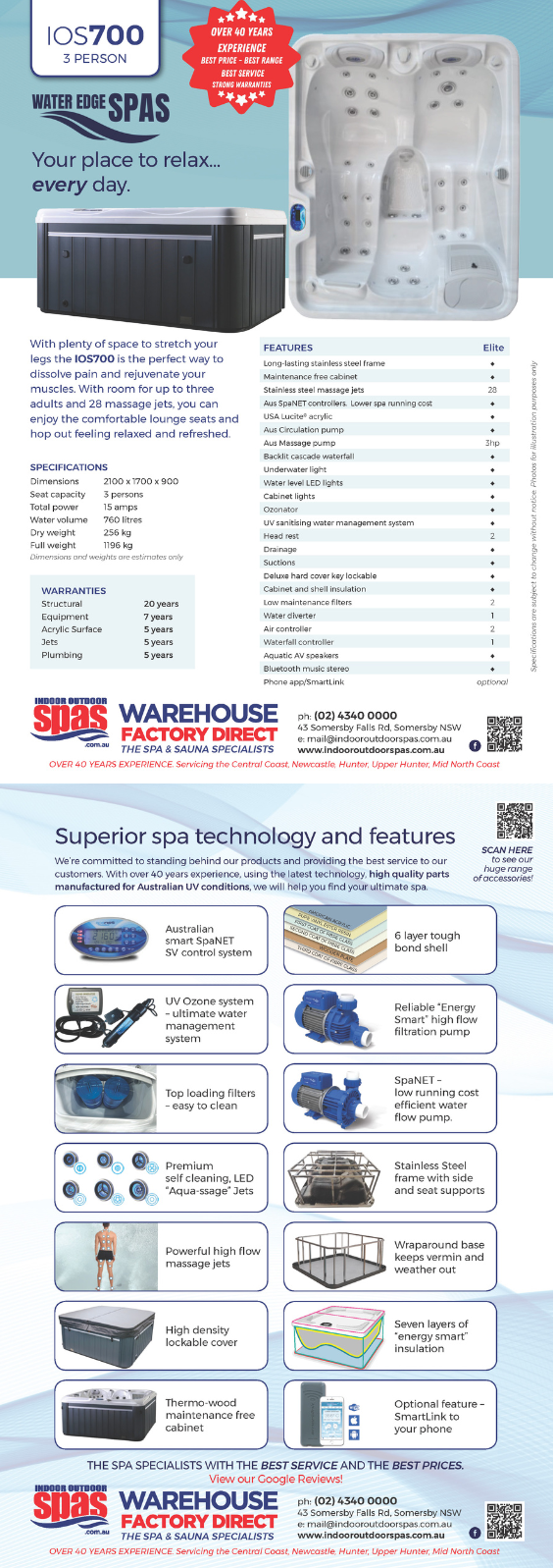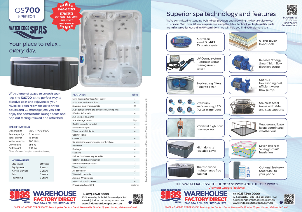 With plenty of spa to stretch your legs the IOS700 is the perfect way to dissolve pain and rejuvenate your muscles. With room for up to three adults and 28 massage jets, you can enjoy the comfortable lounge seats and hop out feeling relaxed and refreshed.